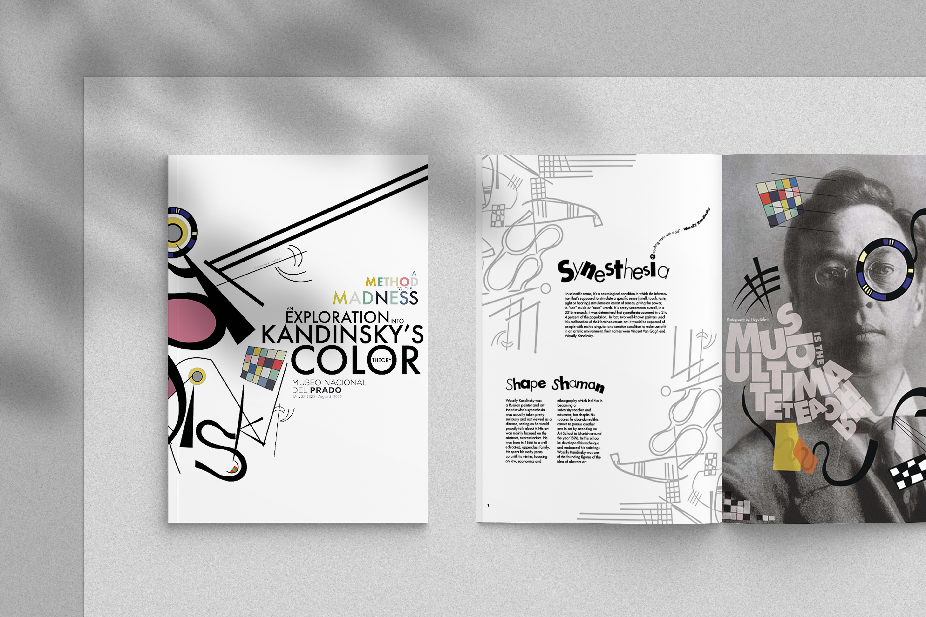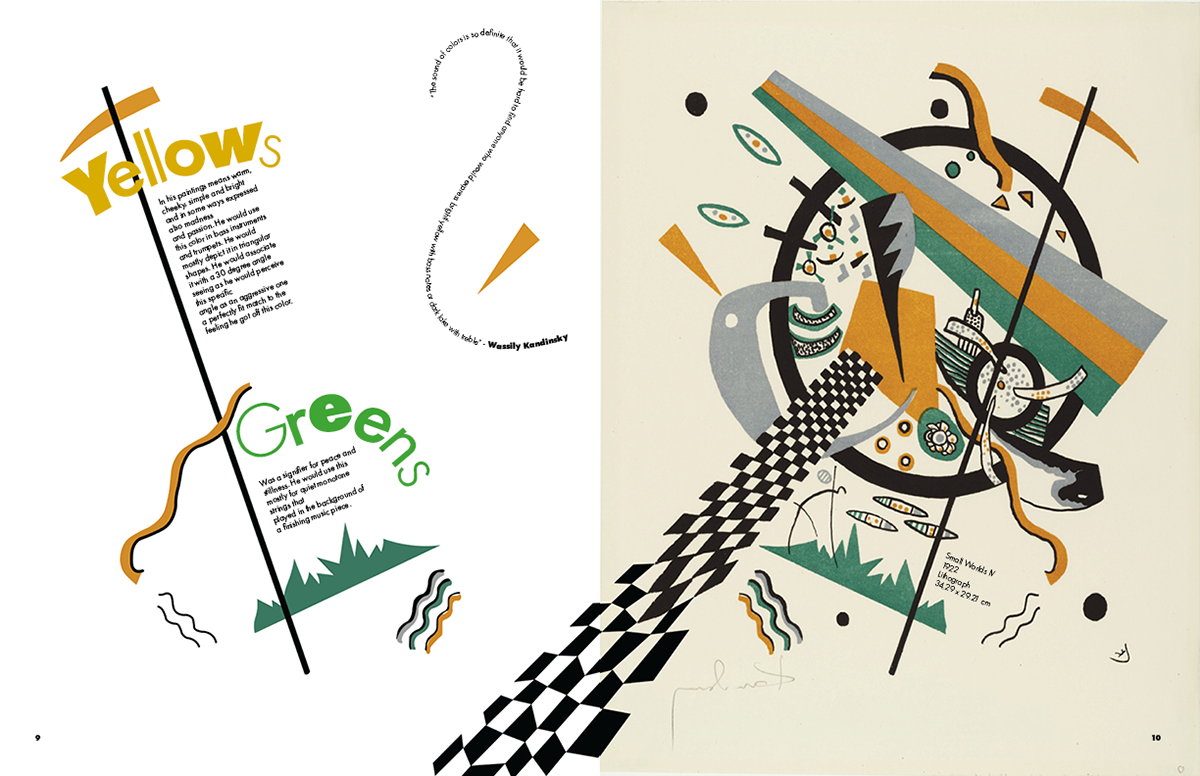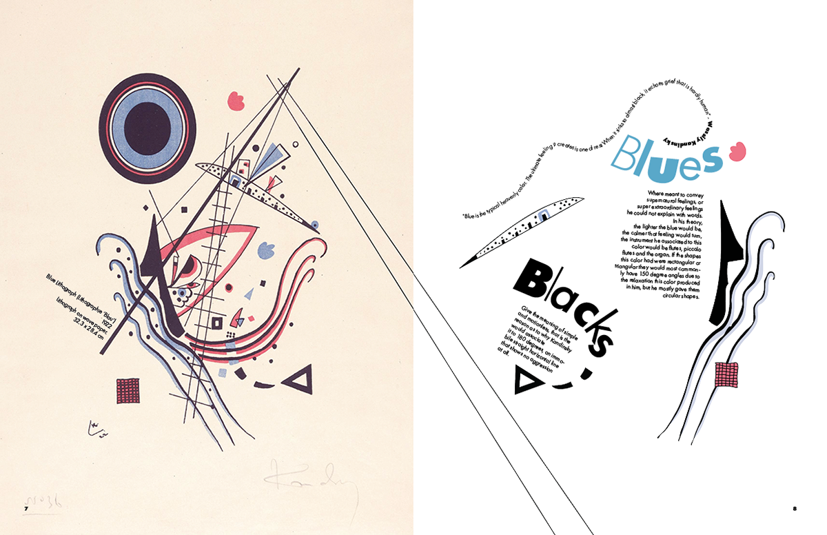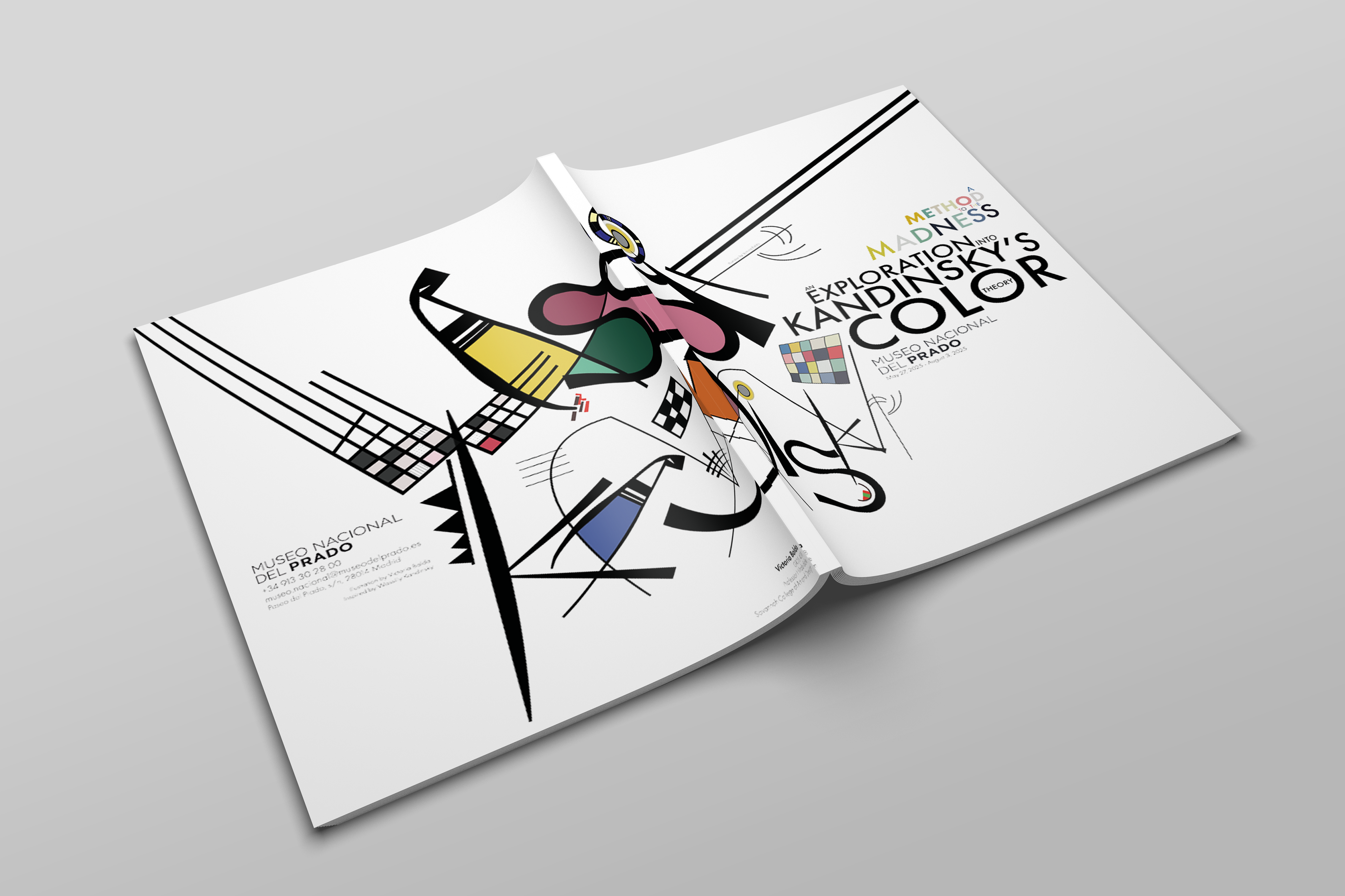 This brochure was designed for a hypothetical exhibition on Wassily Kandinsky’s color theory at the Museo Nacional del Prado. The visual language is constructed entirely from Kandinsky’s own formal vocabulary, those being lines, geometric motifs, textures, and chromatic accents extracted from his paintings. I created a custom display typeface for the introductory spread by deconstructing and recomposing letterforms found in his work, allowing the typography itself to echo his abstract syntax. Throughout the brochure, Kandinsky’s paintings intentionally break their boundaries and spill across spreads, reinforcing the idea of color as an energetic force rather than a contained element. Each section interprets a different aspect of his theory, integrating text with dynamically arranged fragments of his compositions to create a rhythm that mirrors the synesthetic, multisensory quality central to his practice.