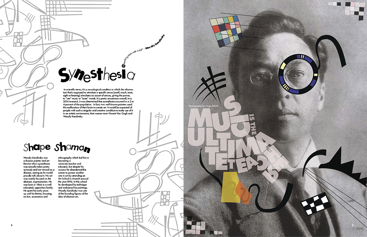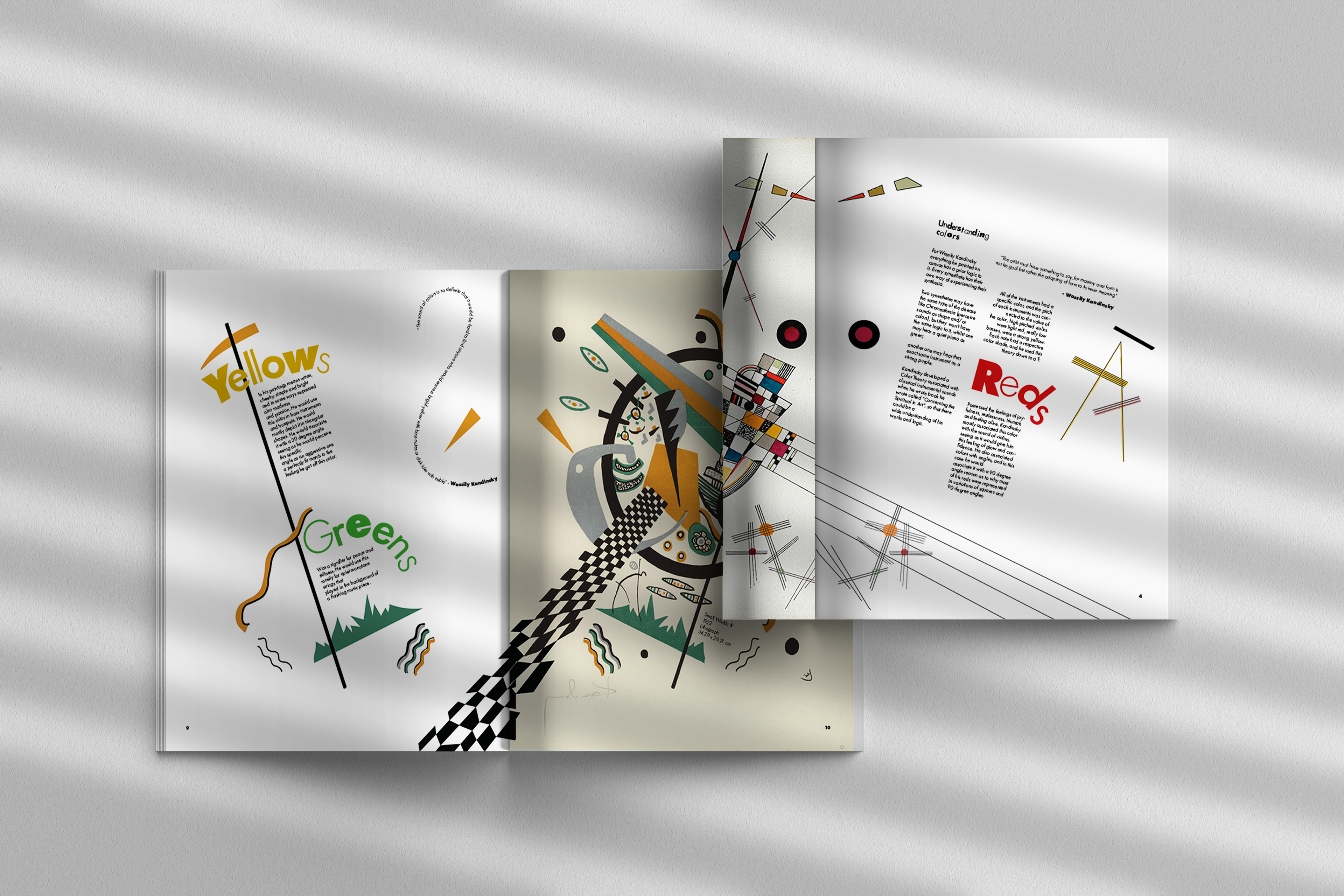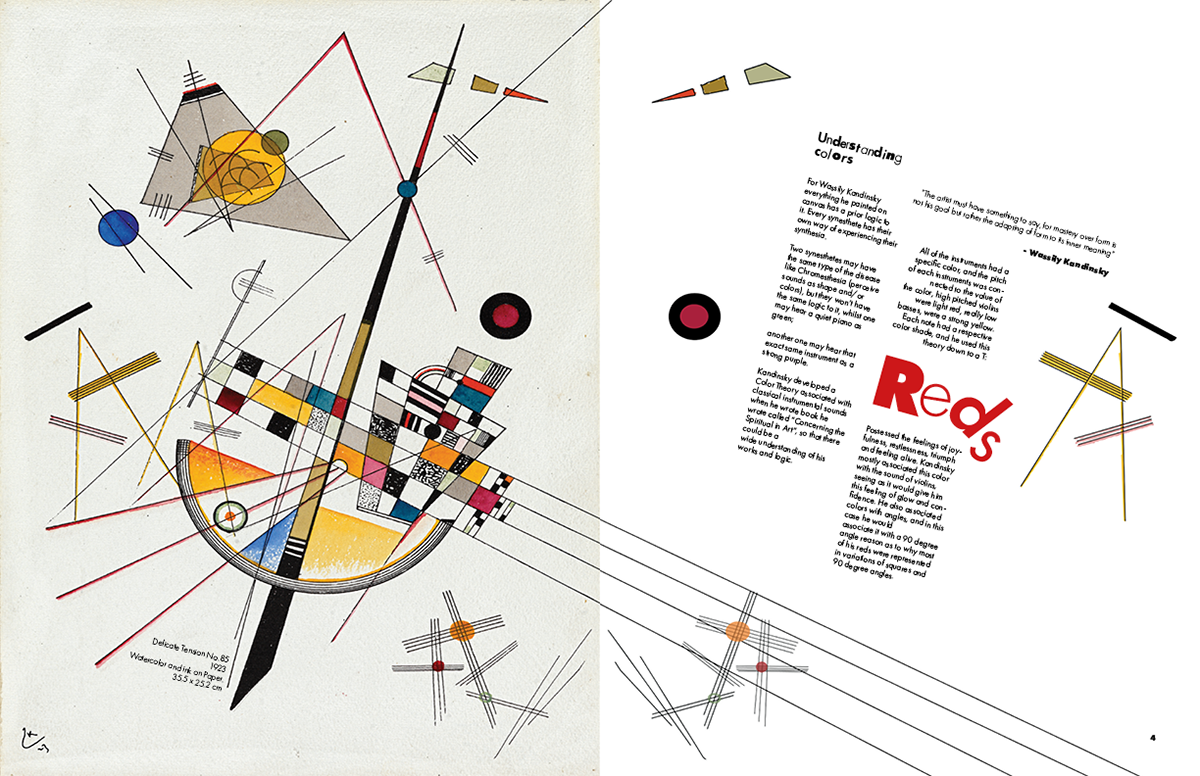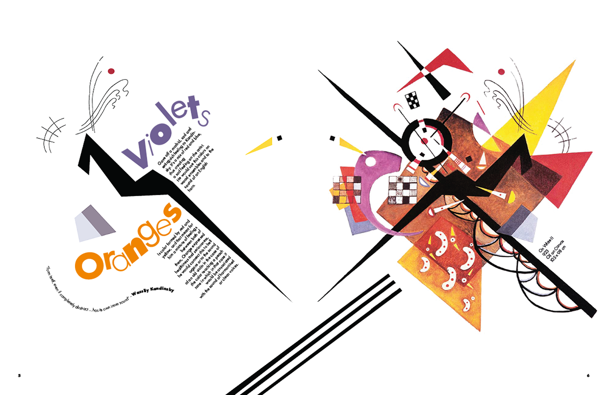 This brochure was designed for a hypothetical exhibition on Wassily Kandinsky’s color theory at the Museo Nacional del Prado. The visual language is constructed entirely from Kandinsky’s own formal vocabulary, those being lines, geometric motifs, textures, and chromatic accents extracted from his paintings. I created a custom display typeface for the introductory spread by deconstructing and recomposing letterforms found in his work, allowing the typography itself to echo his abstract syntax. Throughout the brochure, Kandinsky’s paintings intentionally break their boundaries and spill across spreads, reinforcing the idea of color as an energetic force rather than a contained element. Each section interprets a different aspect of his theory, integrating text with dynamically arranged fragments of his compositions to create a rhythm that mirrors the synesthetic, multisensory quality central to his practice.